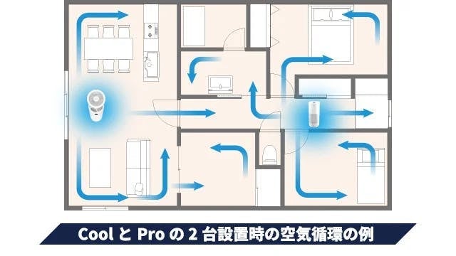 - 1台でリビングを中心に、2台以上で家全体をムラなくクリーンに。リビングにCool、寝室や玄関にProを配置すれば、家中の空気を効率的に清浄化。いつでも安心・快適な空気環境を維持します。