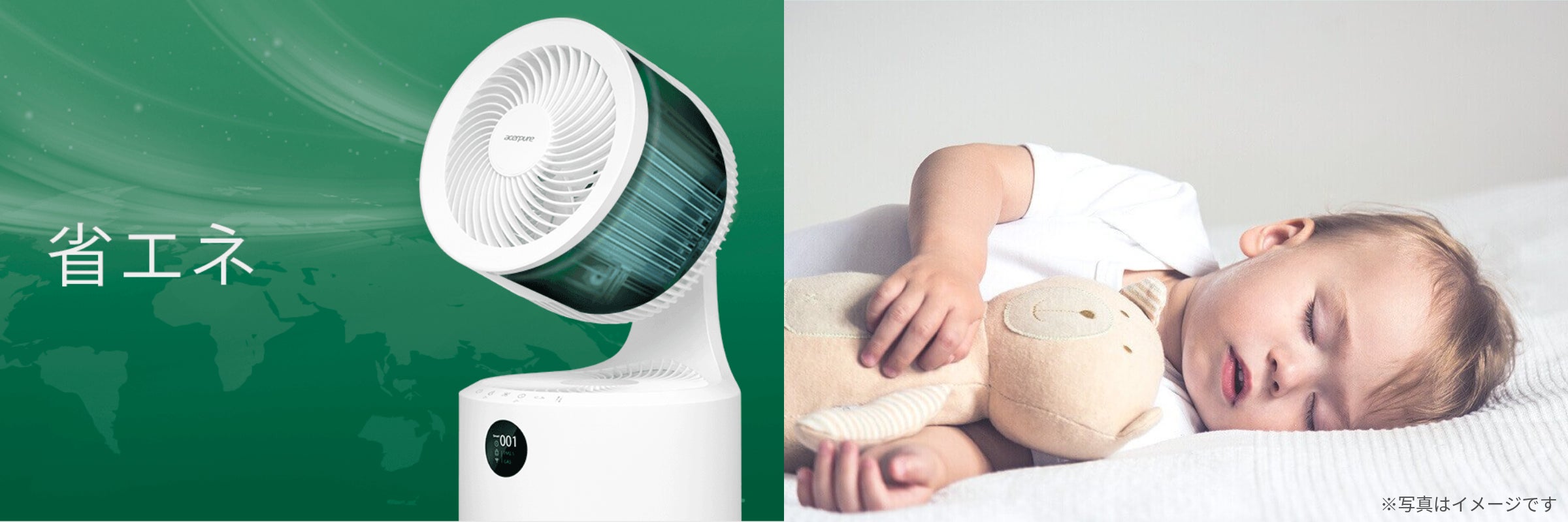 エネルギー効率に優れたDCモーターを採用。最小消費電力4.4W、1時間あたりの電気代は約0.14円(※31円/kWh換算)。最小25dBの静音モードにより、夜間の使用も快適です。