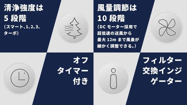 - 最大約30畳(50㎡)まで対応し、8畳のお部屋ならわずか11分で清浄可能。