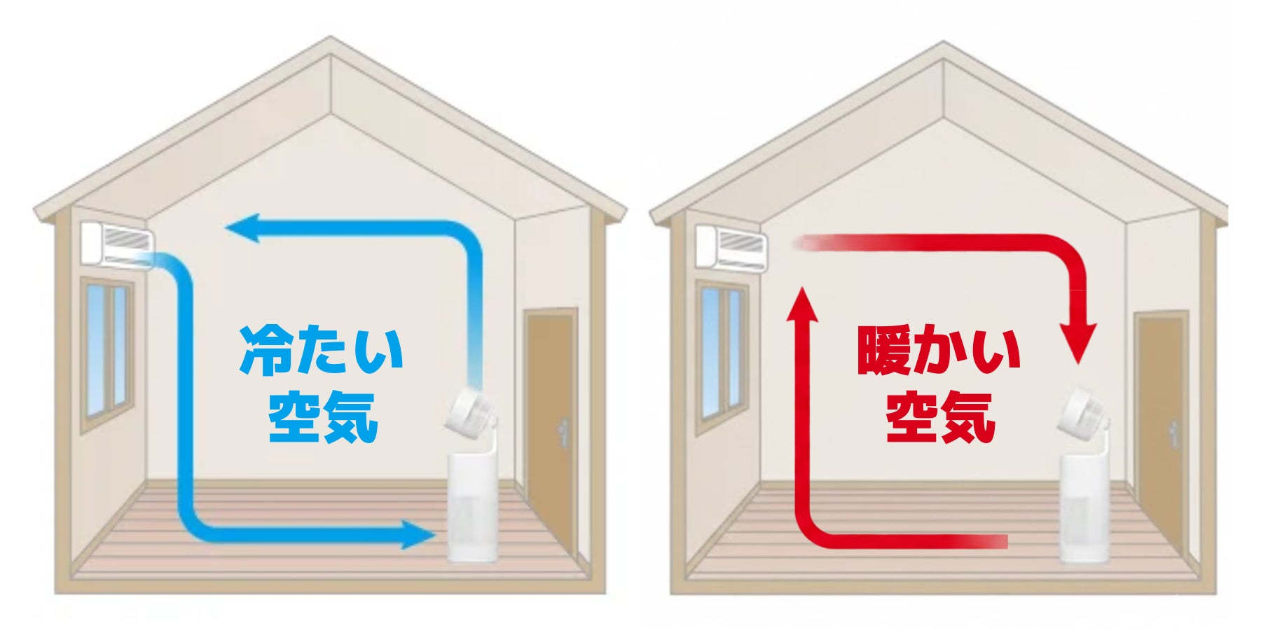 自然な対流を生み出し、冷暖房効率も向上。夏は熱気を、冬は冷気を撹拌し、室内の温度ムラを解消。顔が暑かったり足が寒くなる不快感を防ぎます。