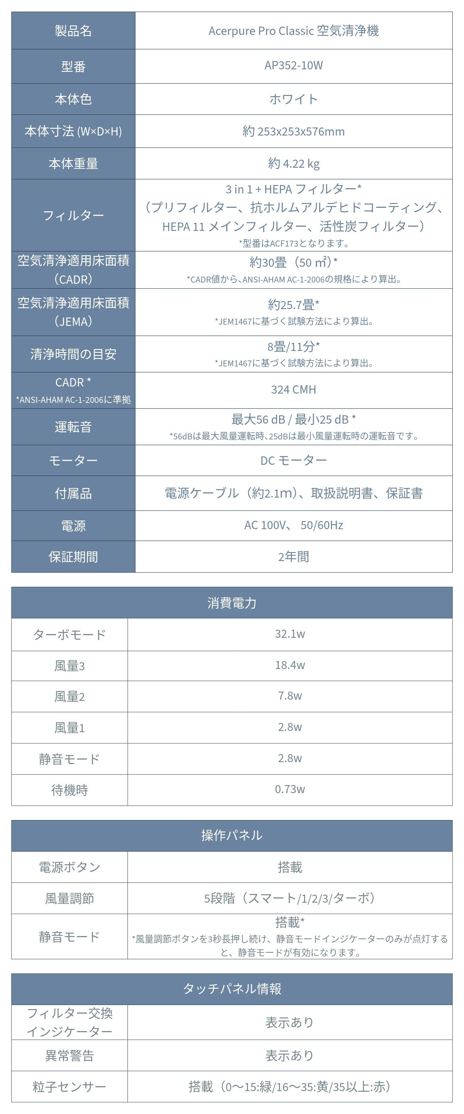 5段階の清浄強度、10段階の風量調整、オフタイマーの設定とそれに加えAppではフィルター交換のインジケーターが確認でき、お手入れのタイミングが分かります。 ▍Acerpure Pro Classic AP352-10W