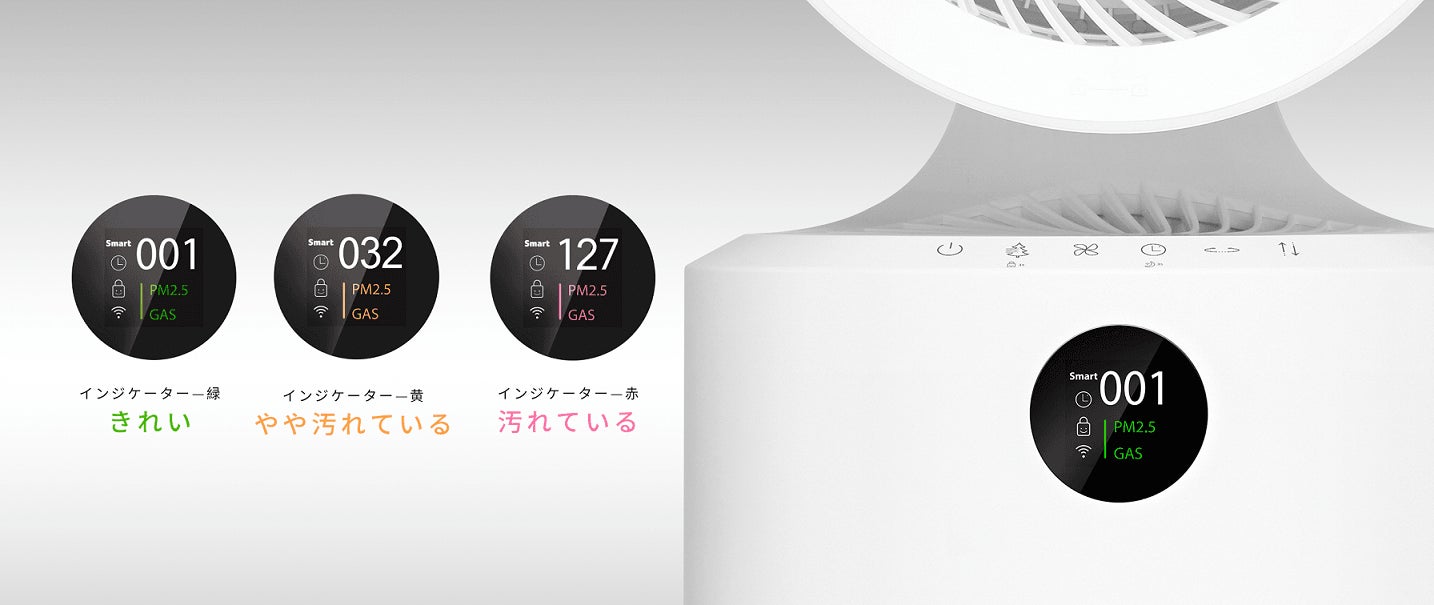 内蔵スマートセンサーが、空気中のPM2.5や汚染レベルを自動検知。液晶インジケーターが空気状態をリアルタイムで可視化し、運転モードを自動で最適化します。