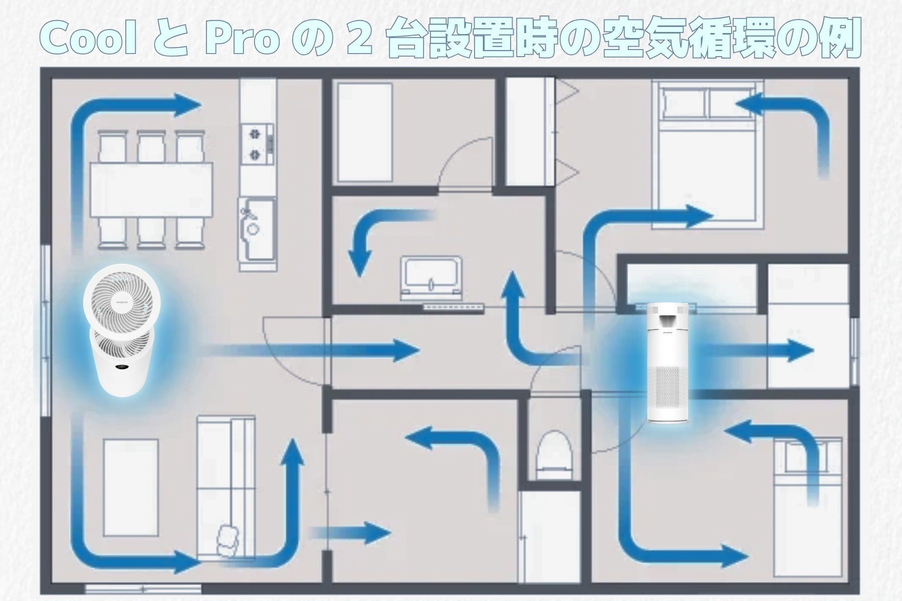 - 1台でリビングを中心に、2台以上で家全体をムラなくクリーンに。リビングにCool、寝室や玄関にProを配置すれば、家中の空気を効率的に清浄化。いつでも安心・快適な空気環境を維持します。