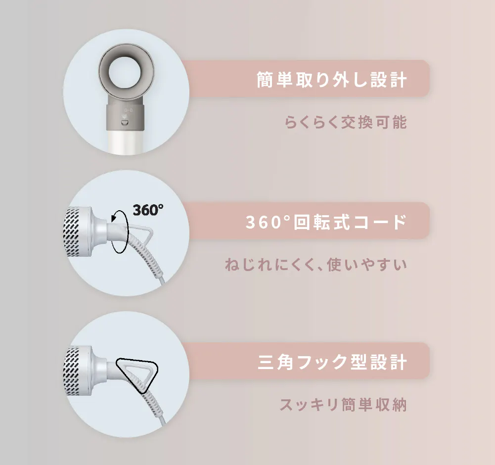 特に「オートラップカーラー*」は、風の流れを利用して髪を自動で吸い寄せ、簡単にカールが作れる画期的なアタッチメント。忙しい朝でも手軽にセットが可能です。