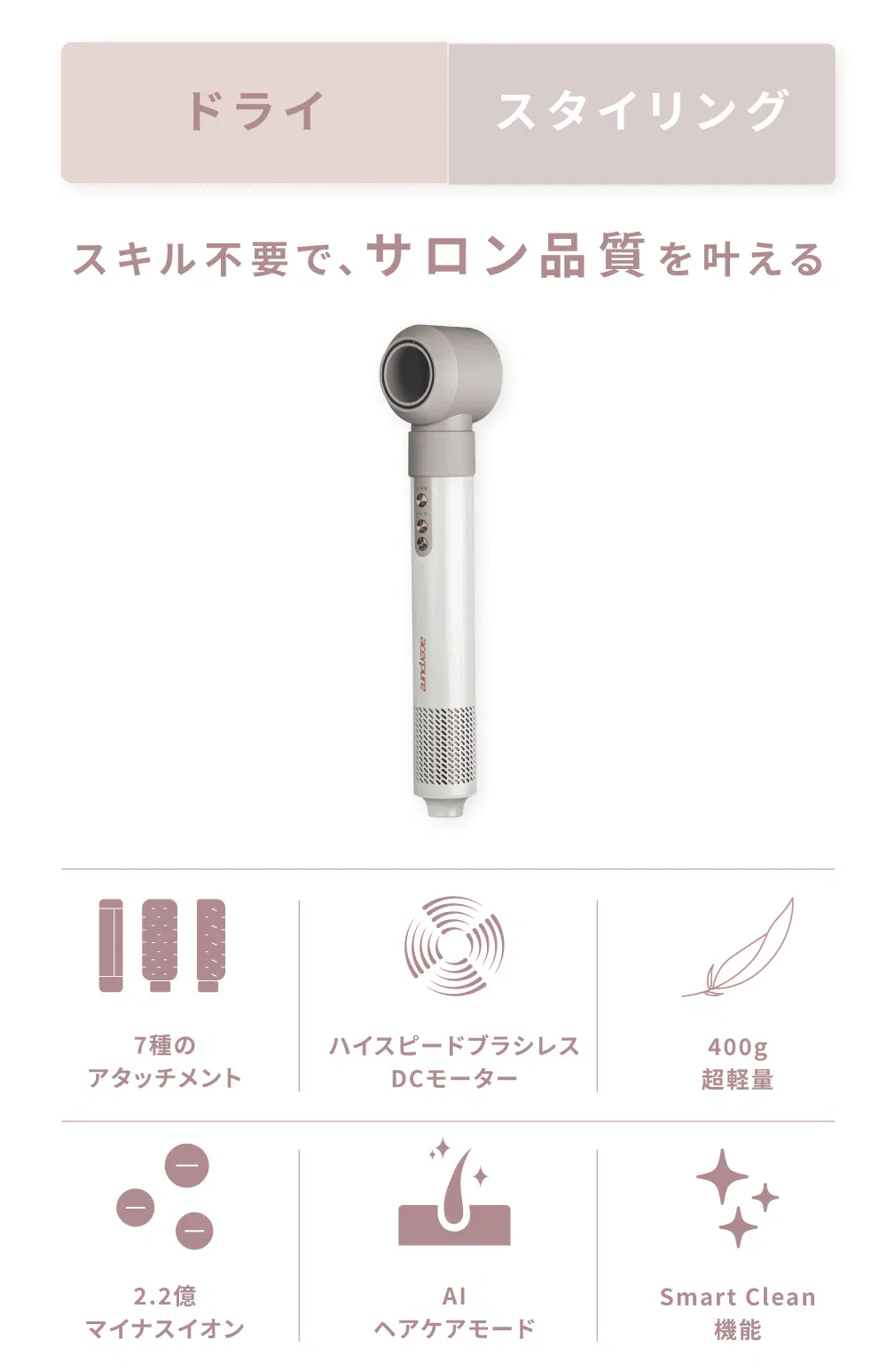 7種のアタッチメント、他社同等品と比べ約40%軽量な400gのボディ、AIヘアケアモードや温度自動調節機能など、優れた機能を搭載。自宅にいながら、まるでサロン帰りの仕上がりを実現します。