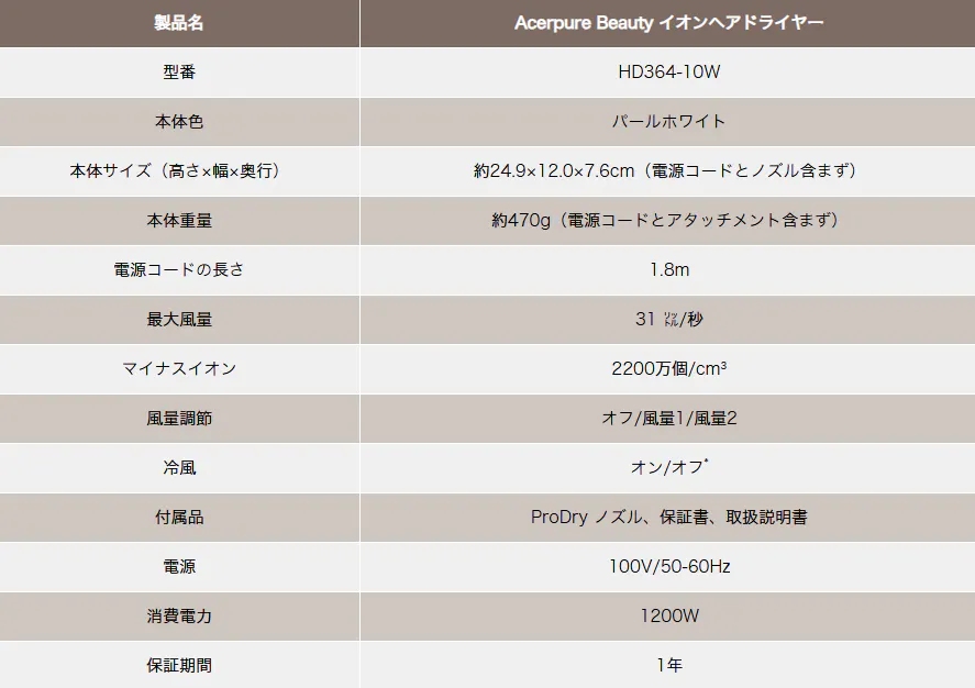 ▍「Acerpure Beauty AIドライヤー」 vs 他社同等品 比較表