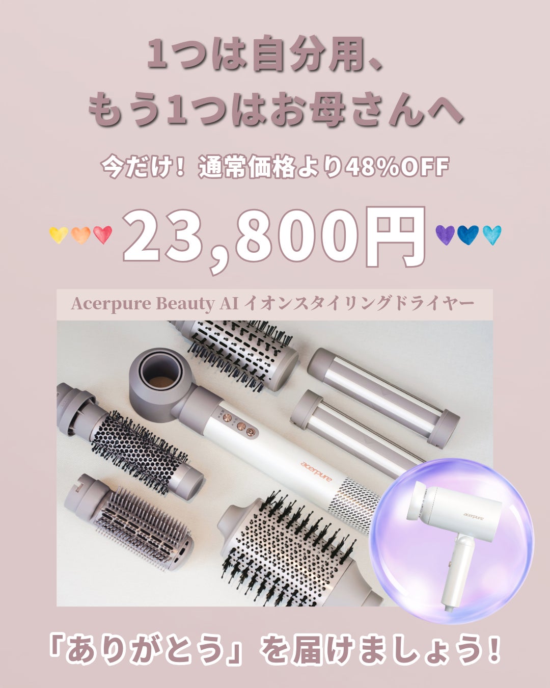 「毎日がんばってる姿を、ちゃんと見てるよ」そっとカタチにしたくて――【2機種セット割】を選ばれる方が増えています(❁´◡`❁)それぞれの“ありがとう”を込めて。♡ 旦那さんから妻へ 自分には《軽量&速乾》のイオンドライヤー 妻には《頭皮ケア&高機能》のAIドライヤー♡ 娘さんからお母さんへ 自分には《ツヤ×スタイリング自在》のAIドライヤー お母さんには《やさしい風で髪を守る》イオンドライヤー毎日使うものだからこそ、ちょっと特別なものを。この機会に、「ありがとう」を届けませんか?★数量限定のセット割は6/30まで★忘れずに今のうちにぜひご支援ください!▶クラファンページはこちら