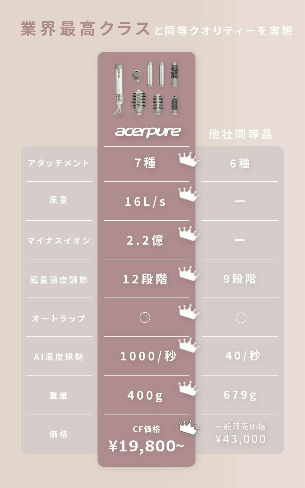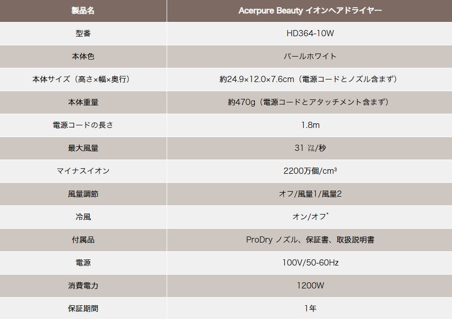 ▍「Acerpure Beauty AIドライヤー」 vs 他社同等品 比較表