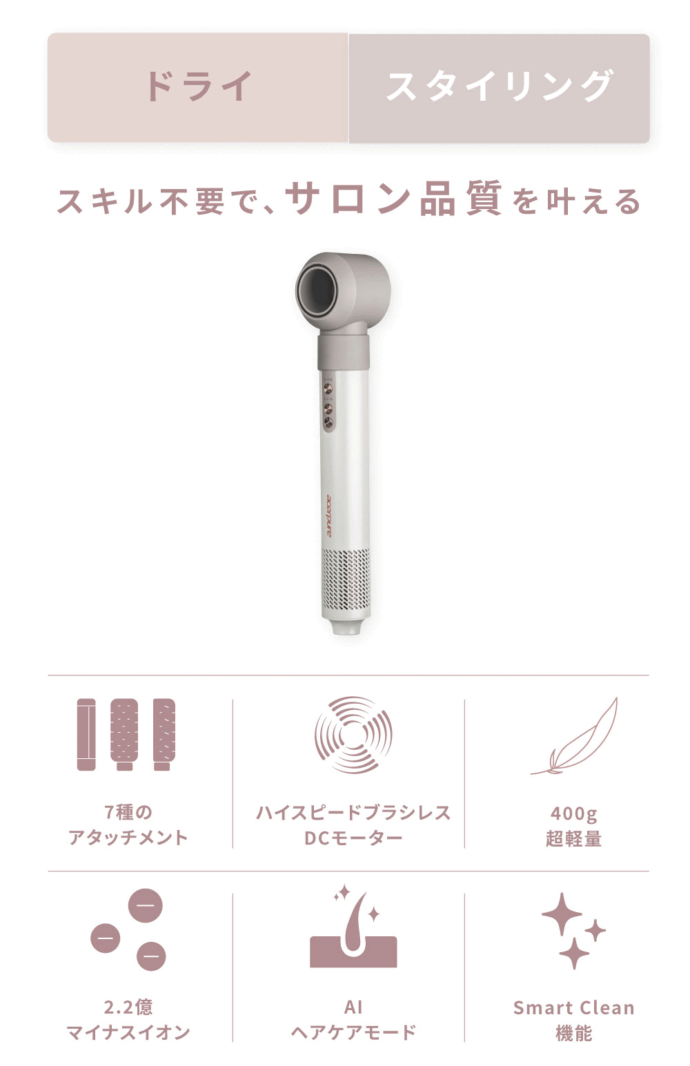 7種のアタッチメント、他社同等品と比べ約40%軽量な400gのボディ、AIヘアケアモードや温度自動調節機能など、優れた機能を搭載。自宅にいながら、まるでサロン帰りの仕上がりを実現します。