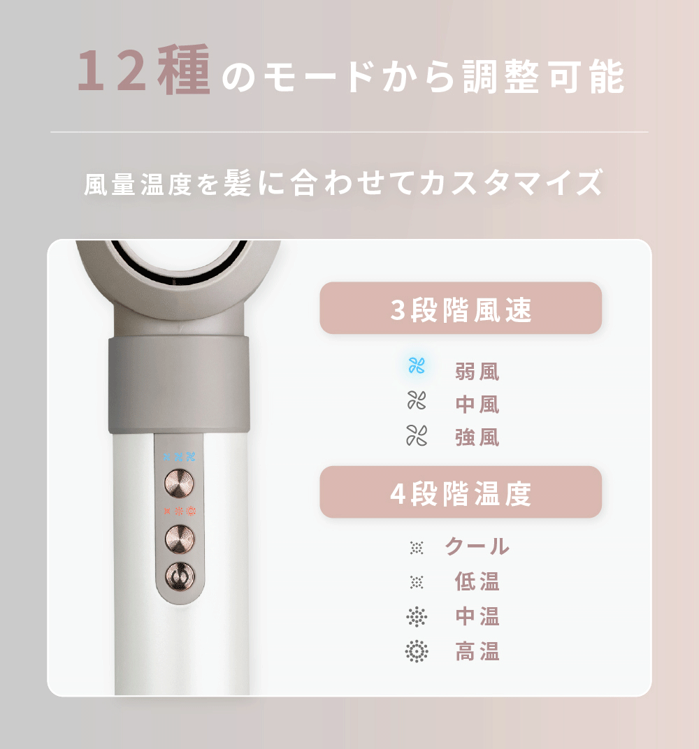 4段階の風温×3段階の風量で、合計12種類の組み合わせが可能。