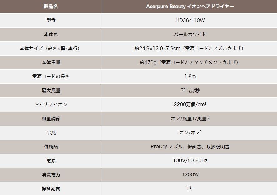 ▍「Acerpure Beauty AIドライヤー」 vs 他社同等品 比較表