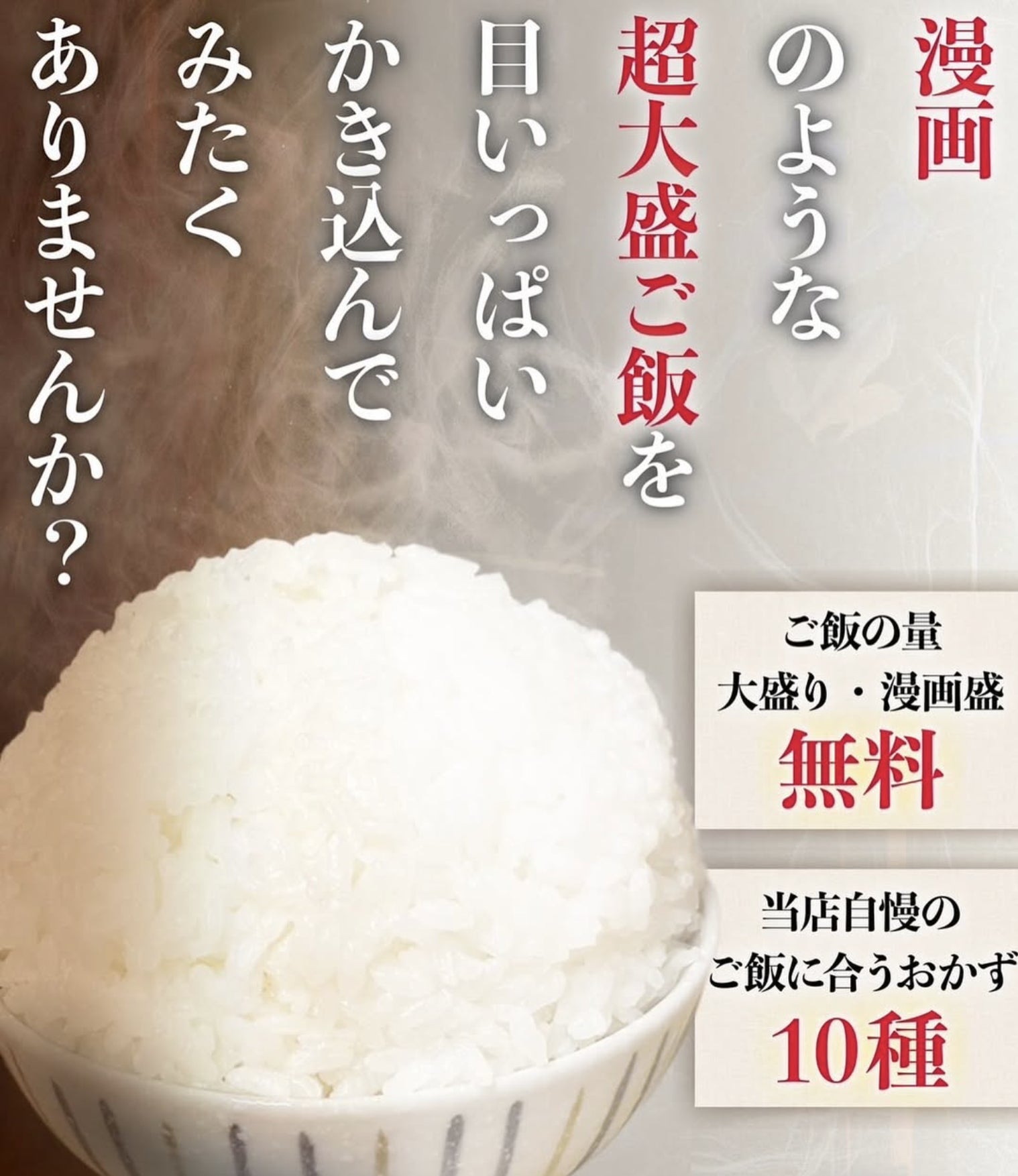ぜひ、他にはないボリューム満点のごはんと心のこもったサービスを当店でお楽しみください。お腹も心も満たされる至福のひとときをお約束いたします!