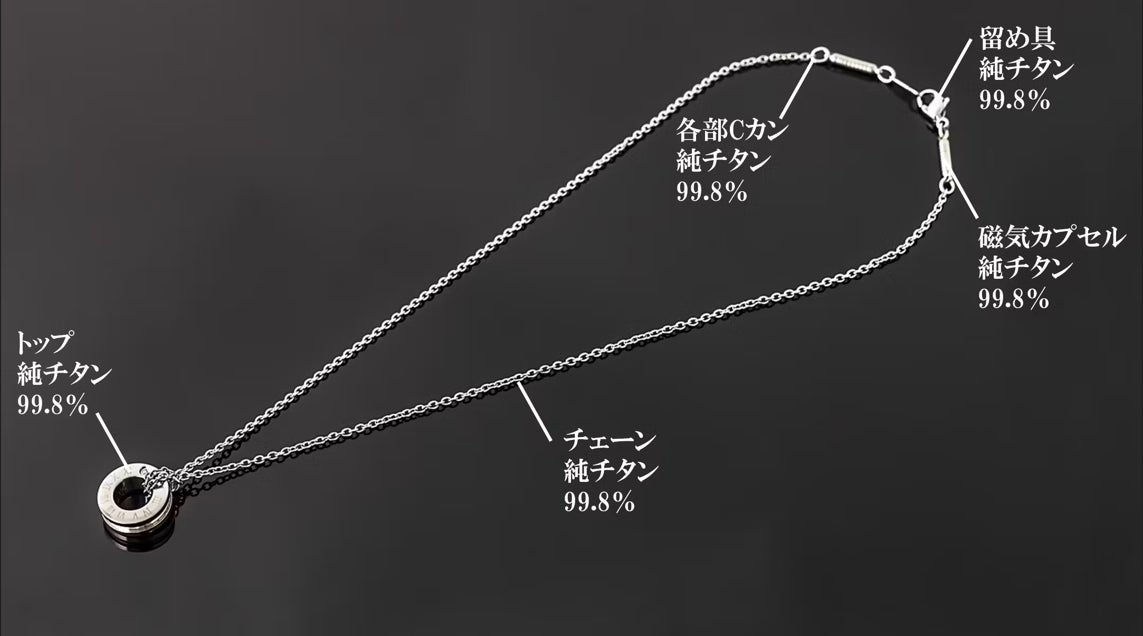 私達「ピュアループ」はトップはもちろんチェーンや磁気カプセル、留め具やその他パーツ全て純チタン99.8%で作っております。