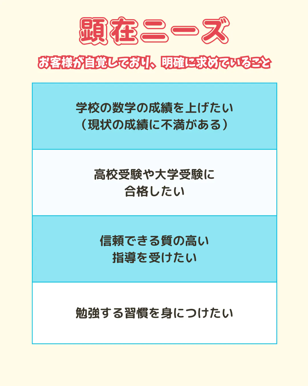 顕在ニーズとは、例えば「定期テストで良い点を取りたい」「苦手な分野を克服したい」「志望校に合格したい」といったように、お客様自身が明確に自覚し、言葉にできるニーズです。