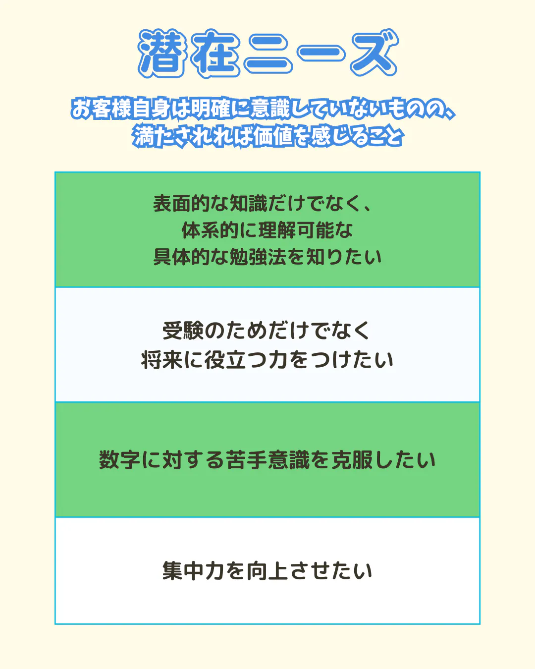 一方、潜在ニーズとは、「将来、社会で活躍できる基礎力を身につけたい」「論理的に考える力を養いたい」「数学を通して、物事の本質を見抜く力を育てたい」といったように、お客様自身はまだ明確に意識していないものの、もし満たされれば大きな価値を感じていただけるであろう、より深い願望や将来への期待のことです。