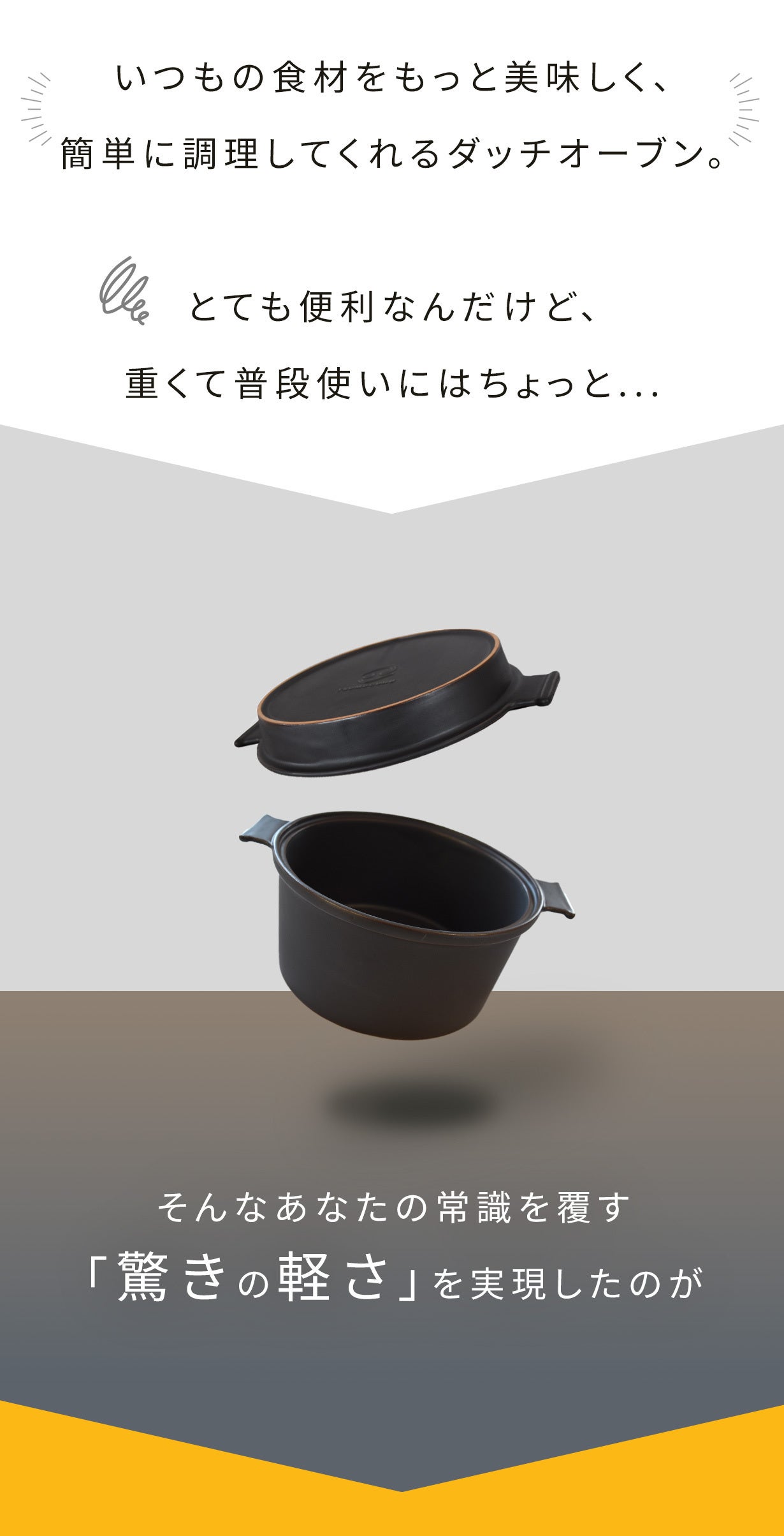 ダッチオーブンといえば、鉄製が主流で重いというイメージがありますよね。確かに美味しい料理は作れるけど、重いし普段から使うにはちょっと…