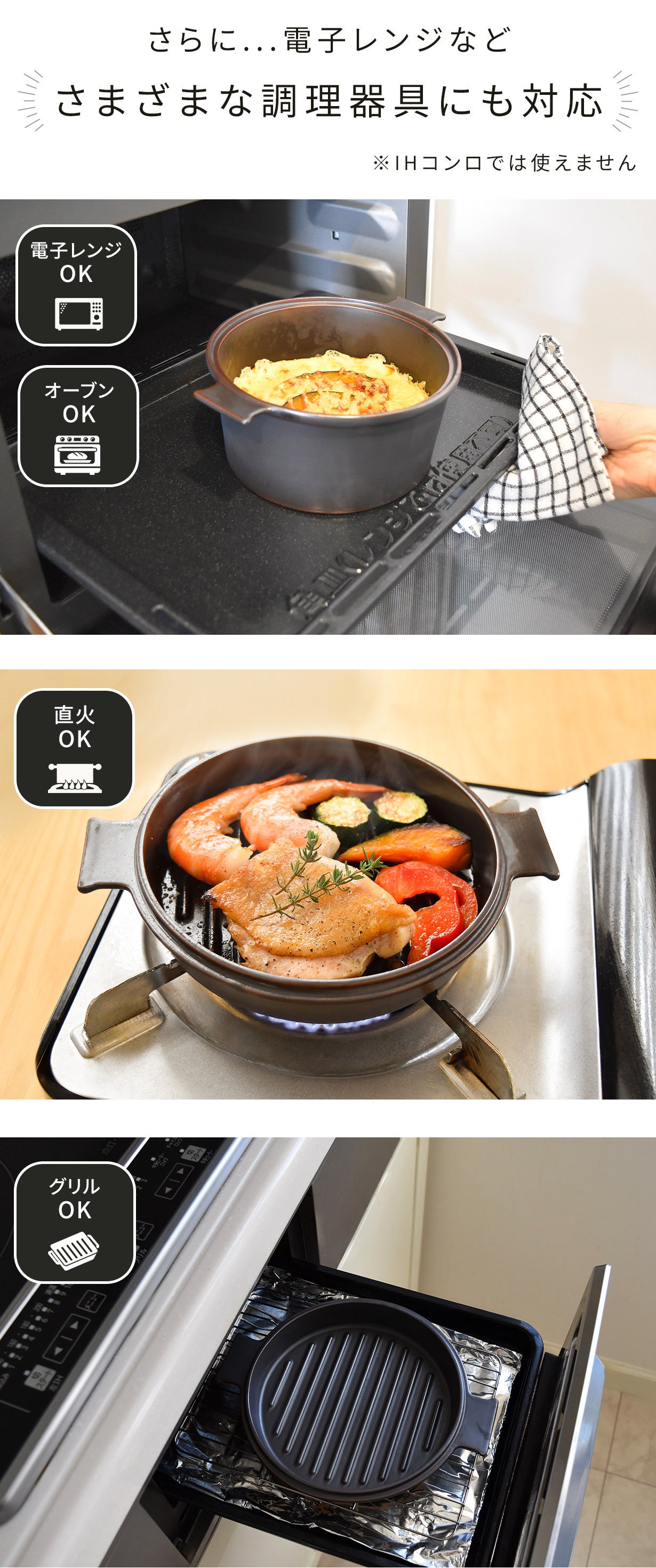 直火、オーブン、電子レンジ、トースター、魚焼きグリル…