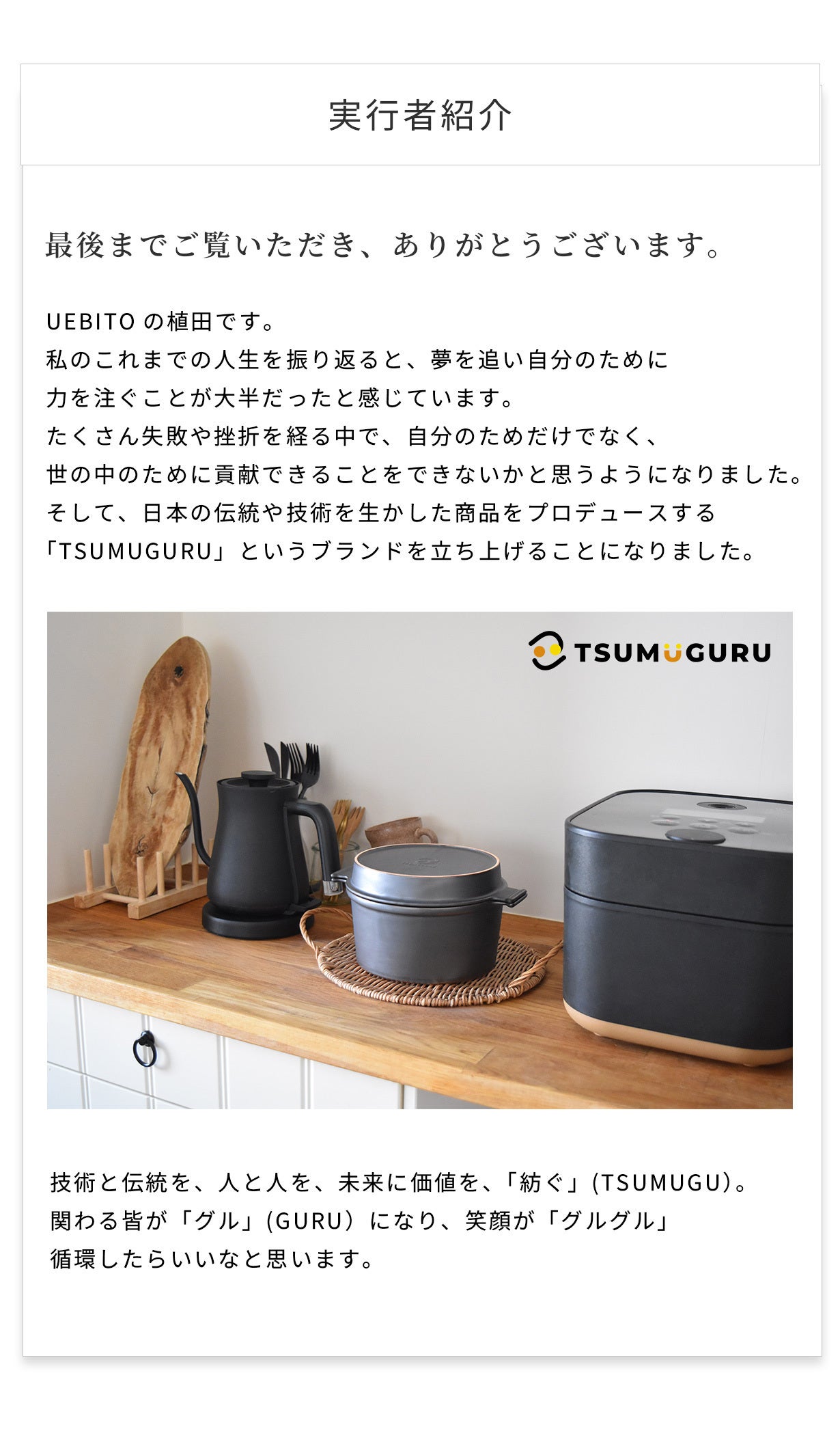 皆さま、はじめまして。この度「TSUMUGURU」を立ち上げました植田と申します。
