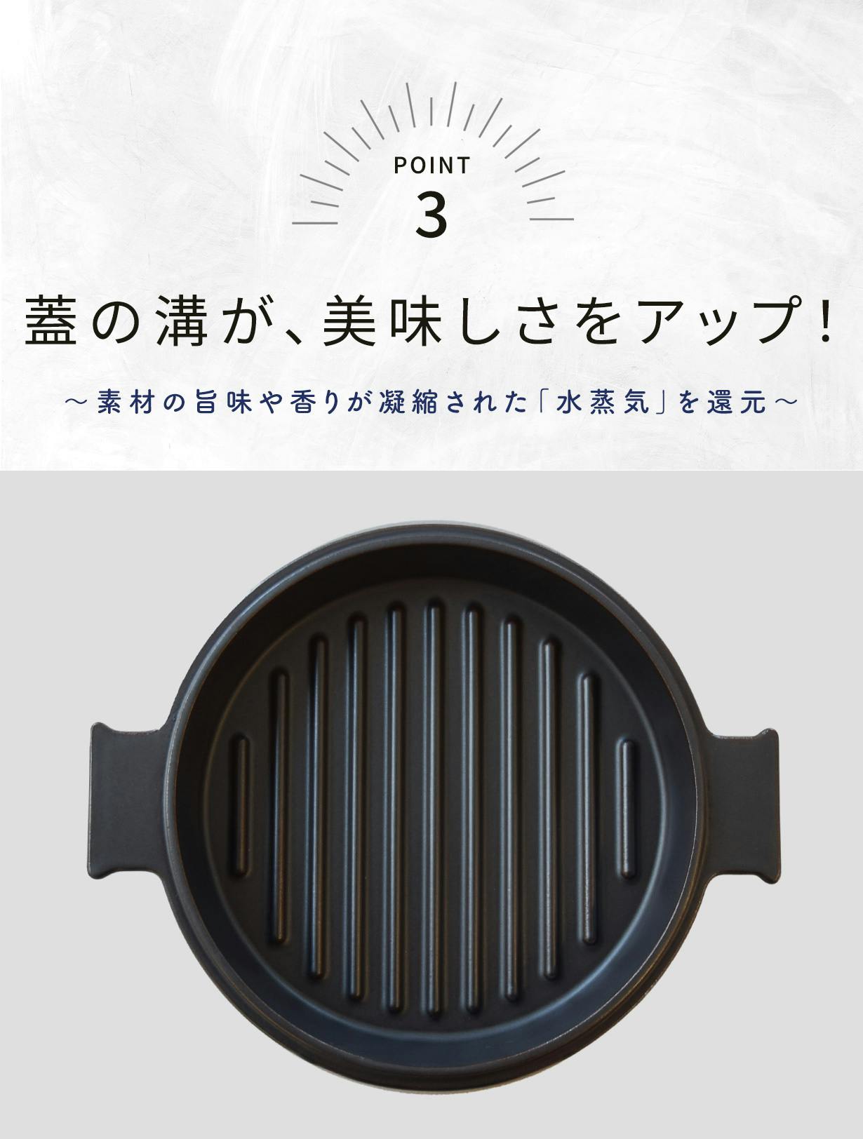 「マルチダッチオーブンSETO」の蓋の内側には凹凸の溝を作製。調理中の水蒸気がこの溝を伝い雨のように降り注ぎます。水蒸気に含まれた素材の旨味や香りを鍋内に閉じ込め、食材の旨味を生かした料理が出来上がります。
