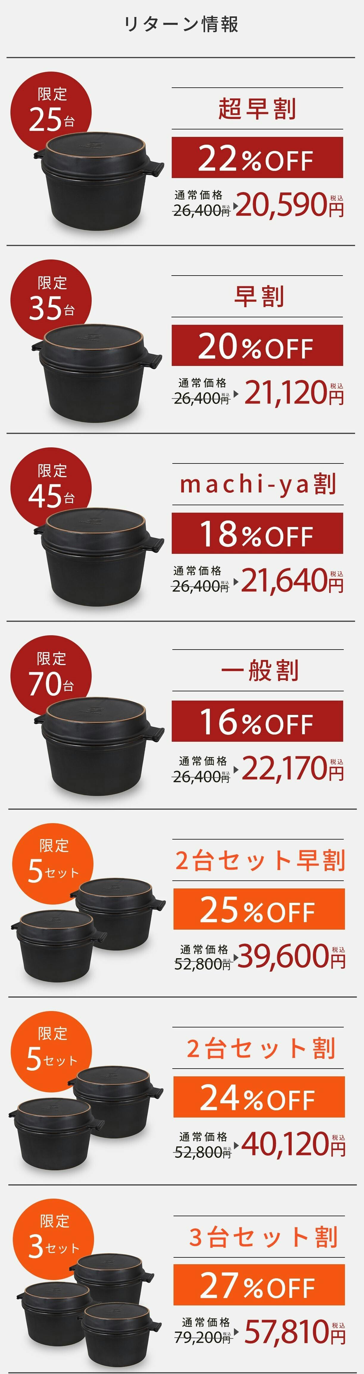 ※リターン価格とは別にCAMPFIRE(machi-ya)のシステム利用料として1支援毎に支援金額1万円未満の場合は250円(税込)/ 1万円以上の場合は支援額の2.5%(税込)が支援者様の負担となります。