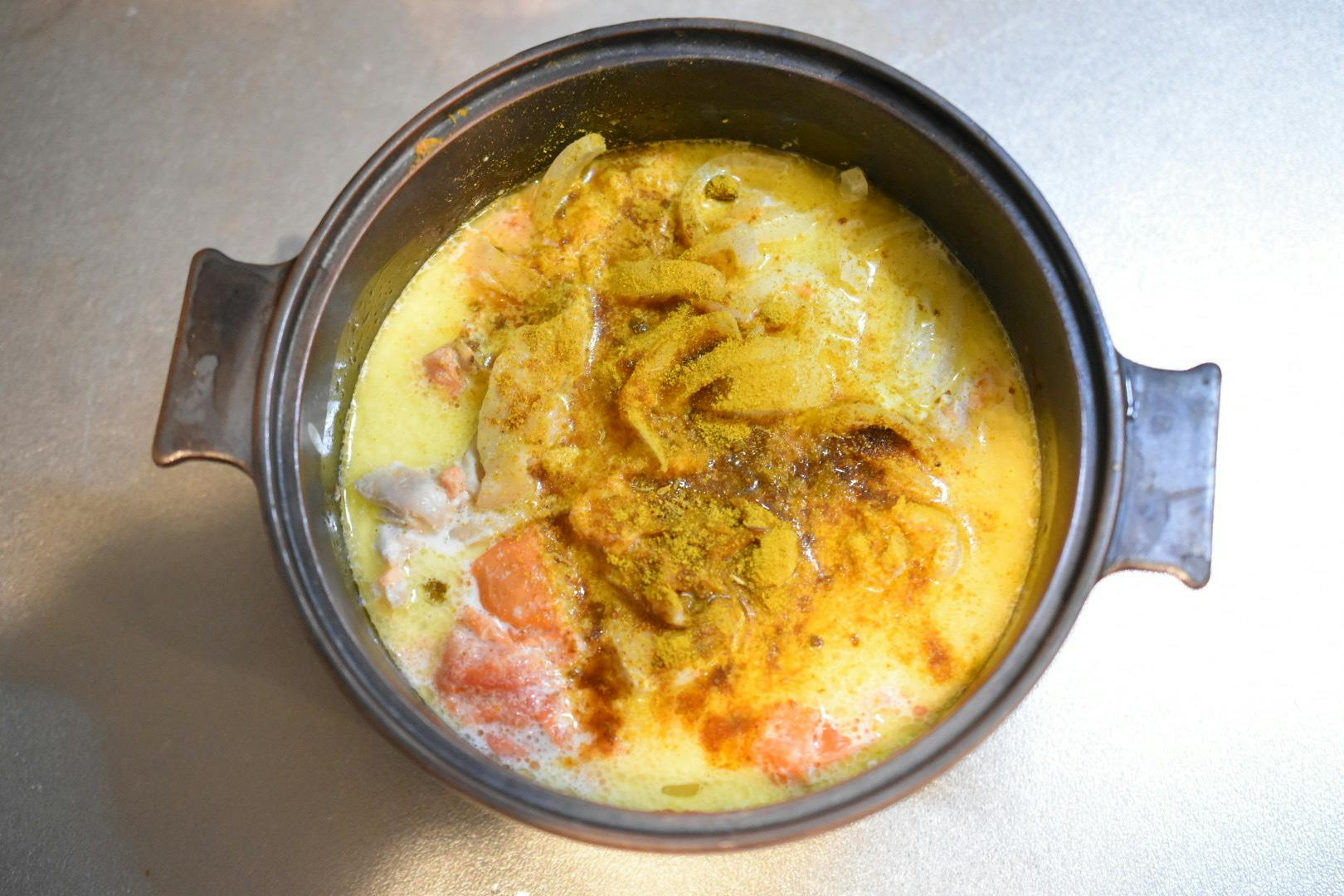 ダッチオーブンに玉ねぎを並べ、その後鶏肉、カレー粉、バター、トマトを順に入れ