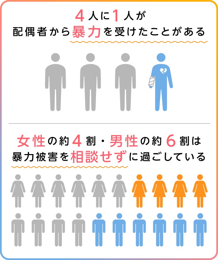 内閣府が3年毎に行っている調査によると、令和2年、令和5年共に【4人に1人】が配偶者から暴力を受けた事があるとされ、また女性の約4割、男性の約6割の方が【どこにも、誰にも相談していない】と回答しています。