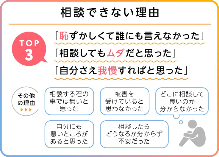 令和5年の調査では、相談までに時間が掛かった(あるいは、出来ていない)理由も調査しており「恥ずかしくて誰にも言えなかった」「相談してもムダだと思った」「自分さえ我慢すれば、何とかこのままやっていけると思った」がトップ3となっていて、それ以外の回答も「本人に情報が届いていれば」「周囲に理解があれば」というものが多くあります。