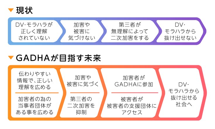 「GADHA」は、加害当事者団体として「DV・モラハラの理解を広める」事を通じて【DV・モラハラから抜け出せる社会】を目指したいと考えています。