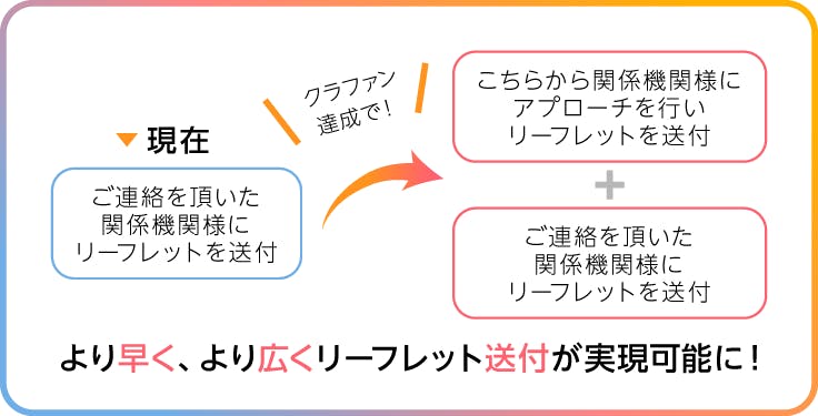 限られた施設や団体へリーフレット・チラシを送付したり、少しの期間だけweb広告を掲載すること、小規模でのカンファレンスを開催は今の我々でも十分可能です。しかし、継続的に、効果的に、そしてより早く届ける事を考えた時、もっと多くの資金が必要だと考えました。