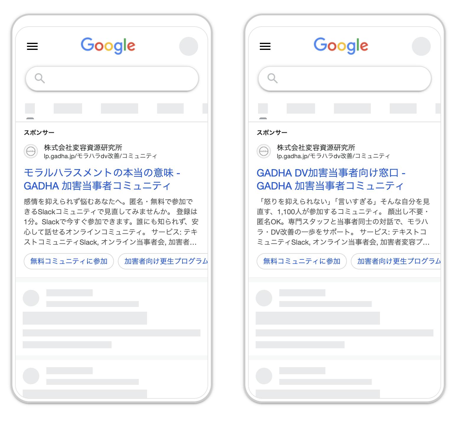 グループ2:今すぐ何とかしたい、変わりたいと思っている方。GADHAの様な団体を求めて検索した時に広告が出る様に設定(顕在層)