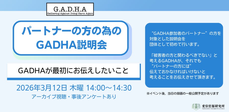 GADHAは、団体として「被害者の方と関わるべきでない」と考えていますが、“GADHA参加者のパートナー”の方には説明をしなければならないことがあるのでは無いかと思い至り、説明会を実施することになりました。イベントページはこちらです。