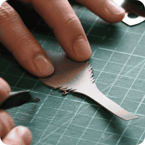 限りなく正確に薔薇を再現するために、必要に応じて革の厚さをパーツひとつひとつ調整しています。