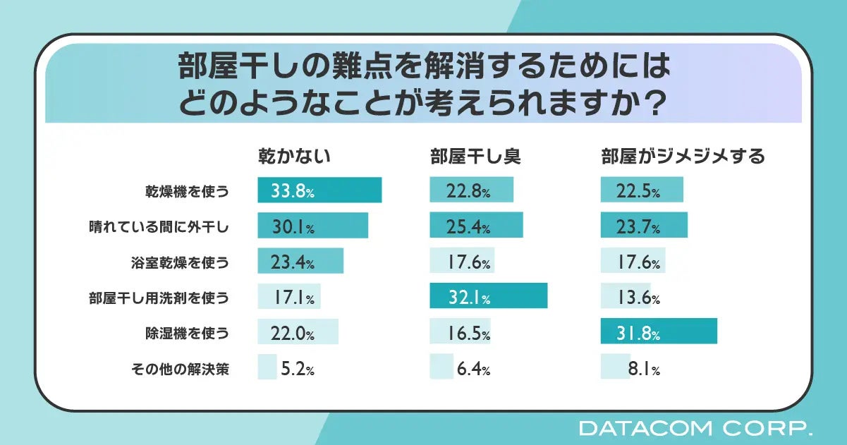 部屋干ししたときの不満は「乾かない」「部屋干し臭」「部屋がジメジメする」ですが、どの悩みにしても「晴れている間に外干しする」対策が次点となっていますね。画像にはない追加調査では乾燥機を持っている人でも約45%の方が外干しを好むそうです。やはり太陽の力には勝てないようですね。