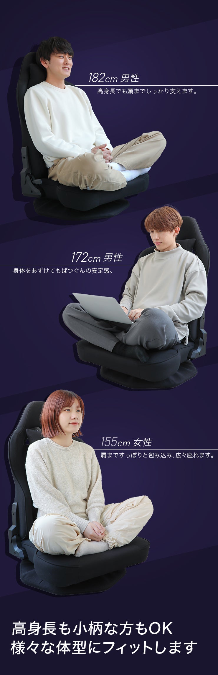姿勢や身長に合わせて位置を微調整でき、背の高い人から低い人まで、だれでも快適に使えます。