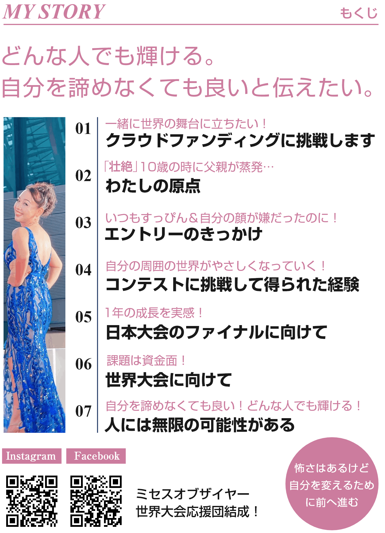 「人生を変えたい」と挑んだ鳥取島根大会では準グランプリをいただきました。次の目標は6月に開催される世界大会へ出場し、シングルマザーとして生きるわたしが
