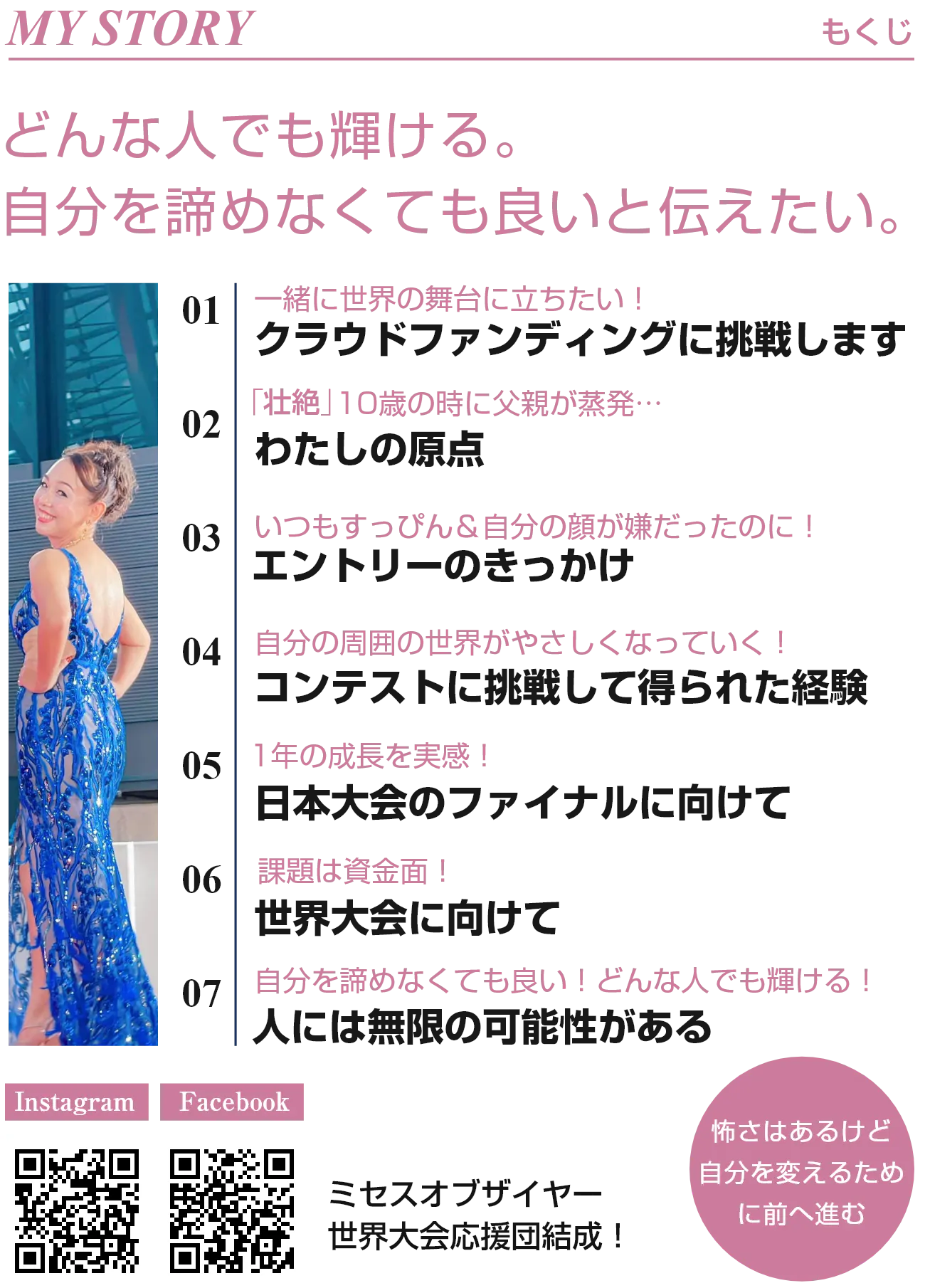 「どんな人でも輝ける。自分を諦めなくても良い。」ということを証明したいと思っています。そして、わたしのように悩み、人生の歩みを止めている方へ「大丈夫だよ。一歩踏み出せば変わるよ」と背中をそっと押せるようになれたら幸せです。