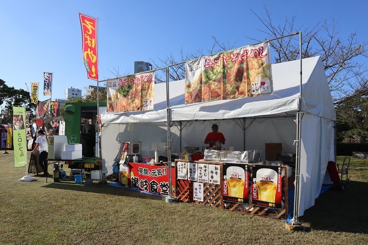 ・地元の料理を楽しめるフードブースや屋台を設け地元のグルメを味わいながら仮想天守閣を設置した玉藻公園内で食べ歩きを楽しむことができます。