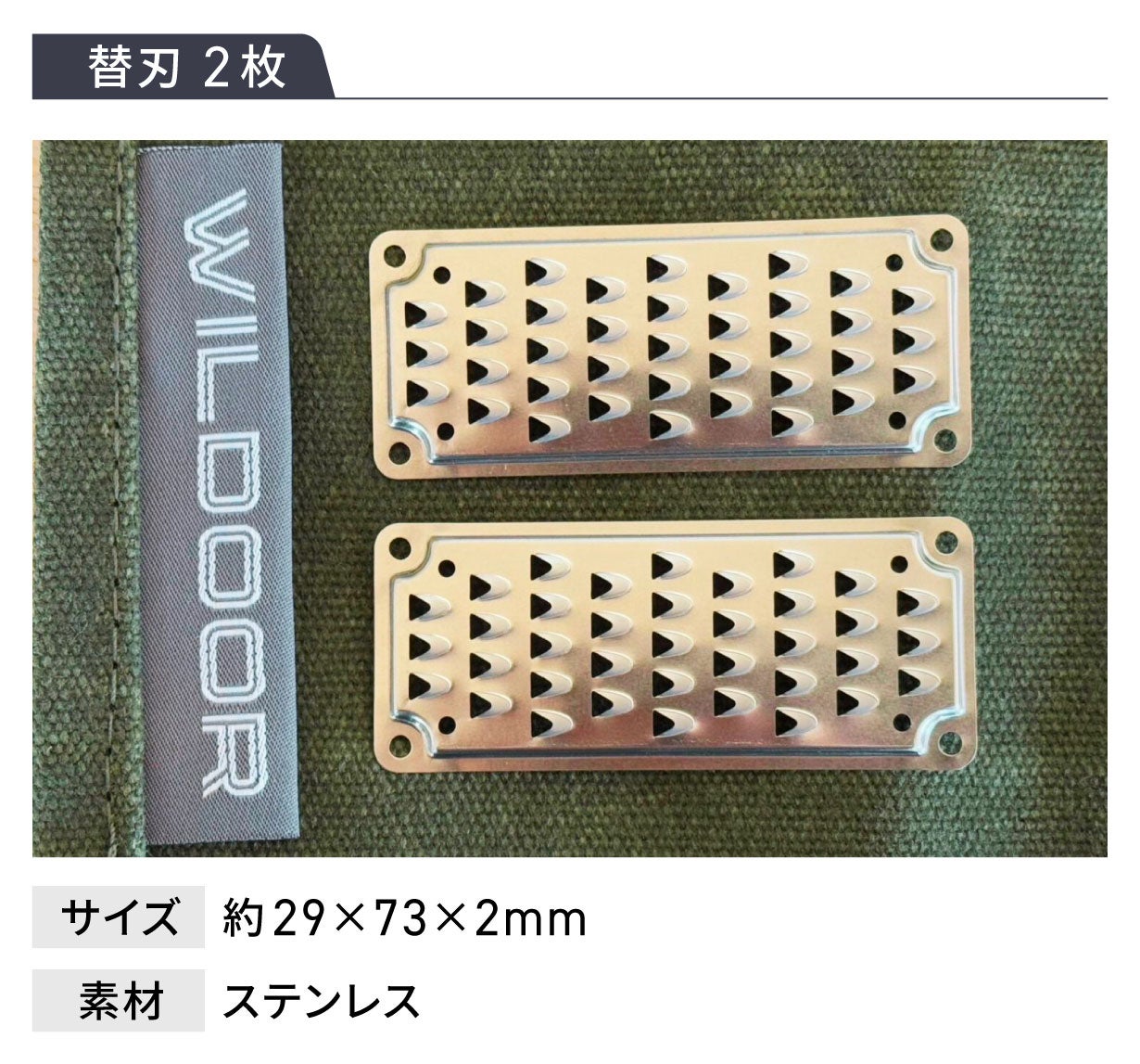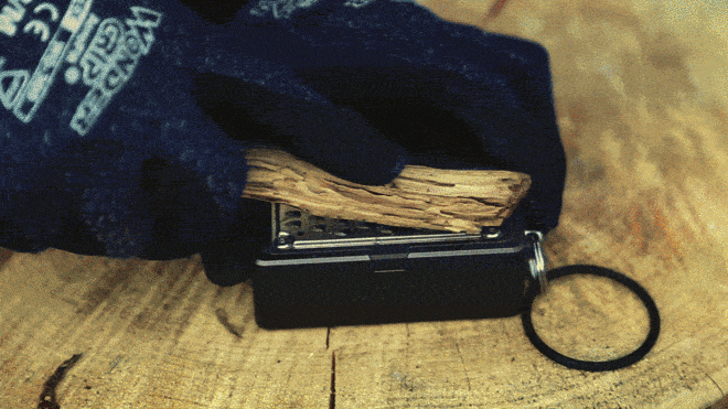 一見何の変哲もない小型おろし金に見えるかもしれませんが、火口(ほくち)として理想の形状になるよう、計算と試作を重ねた上で刃の数、厚み、角度まで最適な設計になっています。 その為、刃の調整も不要で、適当なサイズの針葉樹の枝や薪をスライドさせるだけでOKです!