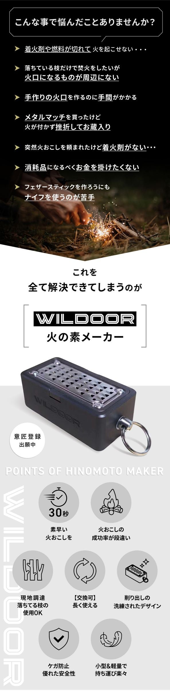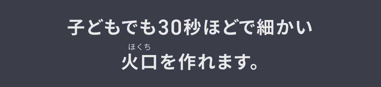 妻と時々キャンプに出掛けるのですが、薪からフェザースティックを作って火おこしをしようとしたことがありました。 手間取っていると、妻から一言、「ガスバーナー使えばいいじゃない。早くご飯食べようよ。」と。 妻のいう事もごもっとも。自分の手で火を起こす楽しみを味わいたかったのですが、あきらめた苦い思い出があります。 その後、チャークロスやフェザースティックなどを使った火おこしの方法も知りやってみて上手くいきました。しかし、その火口(ほくち)を作る作業に結構時間がかかりそのうち止めてしまいました。 そんな経験を通して、開発に至ったのが今回の製品です。
