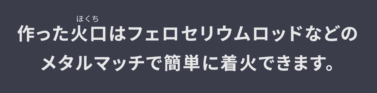 着火性と火の持続性を合わせ持つ最適な形状の火口(ほくち)が出来る為、メタルマッチが苦手な方でも簡単に火おこしが出来るようになります。