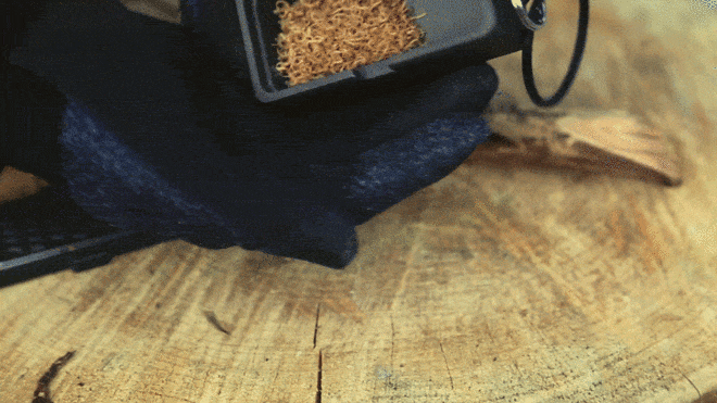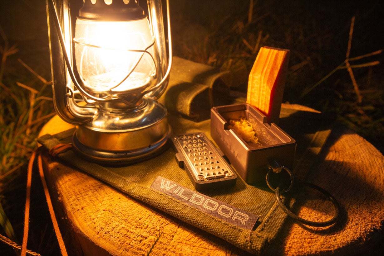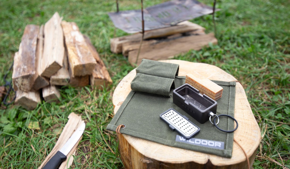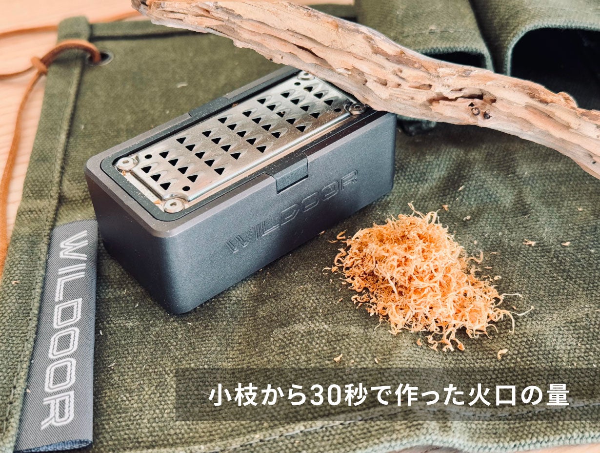 WILDOOR(ウィルドア)の火の素メーカーがあれば、薪(針葉樹)だけでなく落ちている枯れ枝(針葉樹)を使って簡単に火口(ほくち)が作れます。市販の着火剤を購入する必要はありません。着火剤の現地調達が簡単にできちゃうんです。