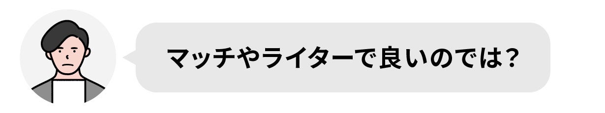 日常生活ではそれで良いと思います! 火の素メーカーは、火を起こすまでの工程を手を動かして楽しみたい方や、災害時やアウトドアでライターやガスバーナー等の燃料切れを心配したくない方向けの製品になります。
