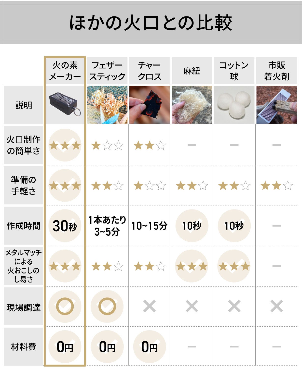 ナイフでフェザースティックを作って着火させる事はできますが、メタルマッチで着火させられるくらい薄く削るのは慣れと技術が必要ですし、時間がそれなりにかかります。それを楽しめる方だったらそれでも良いと思います。 火の素メーカーは誰もが手軽に素早く火を起こせる製品です。