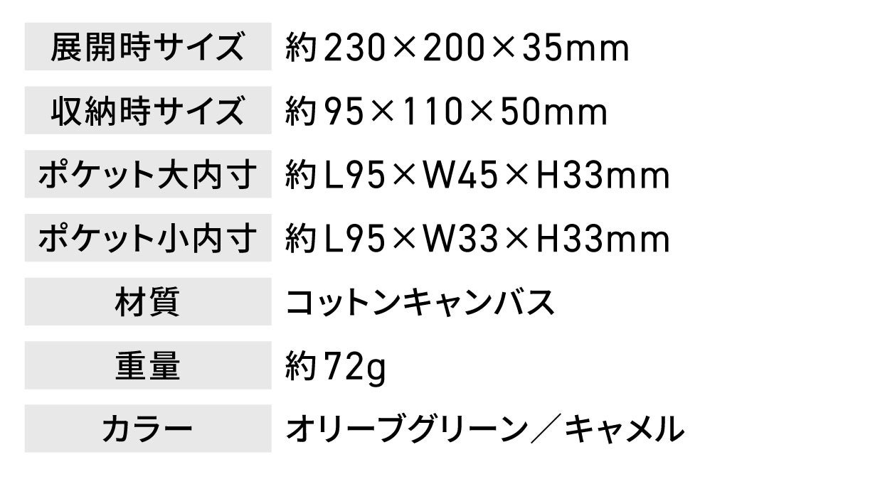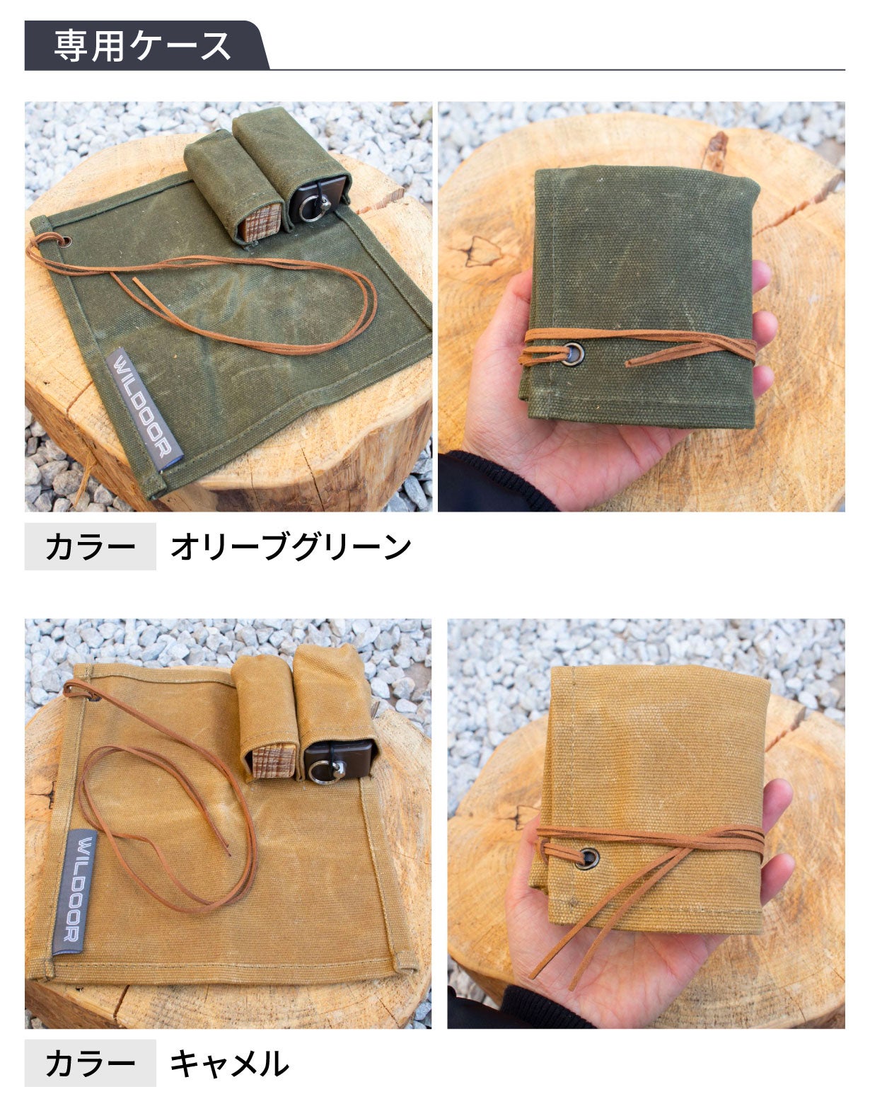 16オンスの厚手のキャンバス生地を使用した専用ケースです。大小2つのポケットが付属します。展開した状態では火口(ほくち)を作る際の作業用スペースとしてご活用いただけます。