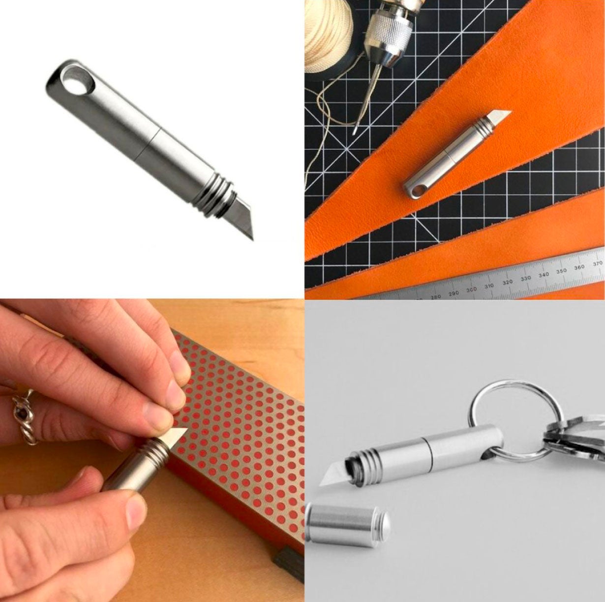 素材は、高級時計や航空宇宙業界等に使用される「グレード5チタン」。 純チタンのような濃いグレーではなく、ステンレスの色合いに近い素材感が特徴です。ヴィッカース硬さは300前後で一般的なステンレスよりも若干硬い程度ですが、純チタンの2倍の硬度を誇ります。 またマイクロナイフDagrは一般的な砥石で研ぐことで切れ味を蘇らせることができます。