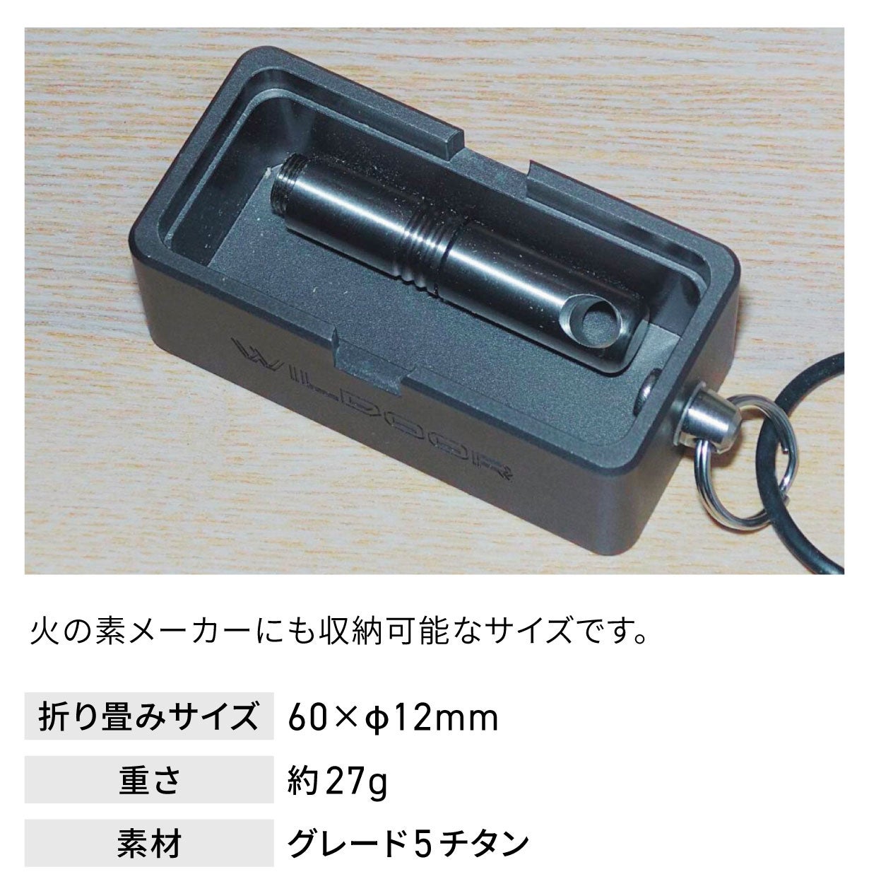 火起こしに使用する訳ではありませんが、火の素メーカー内に収まり、持っているといざという時に役立ちます。
