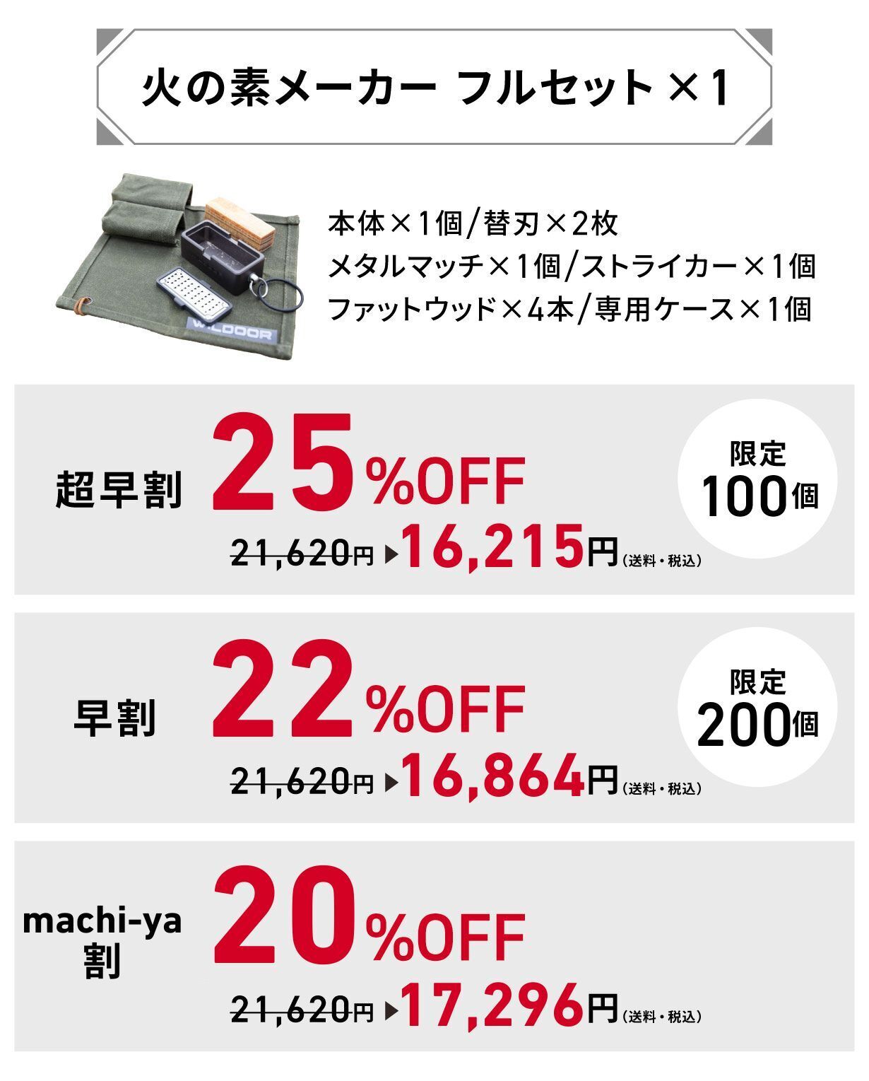2025/10/29 18:13大変お待たせいたしました!火の素メーカーですが、2回にわたるクラウドファンディングでは延べ650名の方々からご支援をいただき、無事に完了しました。応援下さった皆様、本当にありがとうございました!お陰様で本日、WILDOOR公式ショップをオープンする事ができましたのでお知らせいたします→https://shop.wildoor.net/公式LINEのご登録者様だけに【11月5日】までの期間限定で割引クーポンも配布していますので、ぜひお見逃しなく!ご不明点等ございましたら、公式LINEにてなんでもお気軽にお問い合わせください。今後ともどうぞWILDOOR(ウィルドア)をよろしくお願いいたします! もっと見る発送完了のご報告とご支援のお礼
