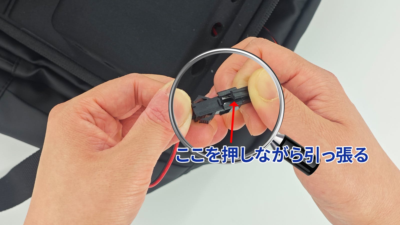 電源の接続:リュックのUSBケーブル( Type-A)をお手持ちのモバイルバッテリー(出力が5V-2A以上のもの)に接続するだけです。