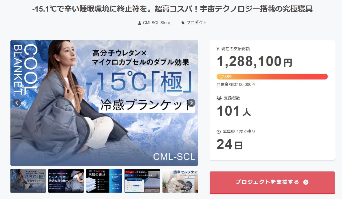 サポーターの皆様こんにちは、「-15.1℃極冷寝具」プロジェクト運営チームです。本日10時より始まったプロジェクトが、開始よりわずか1時間で、目標金額に達成しました!初日からご支援いただいた皆様、本当にありがとうございます。大変お得な超早割リターンは数量限定になっており、ぜひお見逃しなくお早めのご利用をおすすめいたします!プロジェクトは本日より、約46日にわたって実施されます。プロジェクトのシェア・拡散にご協力お願いいたします!