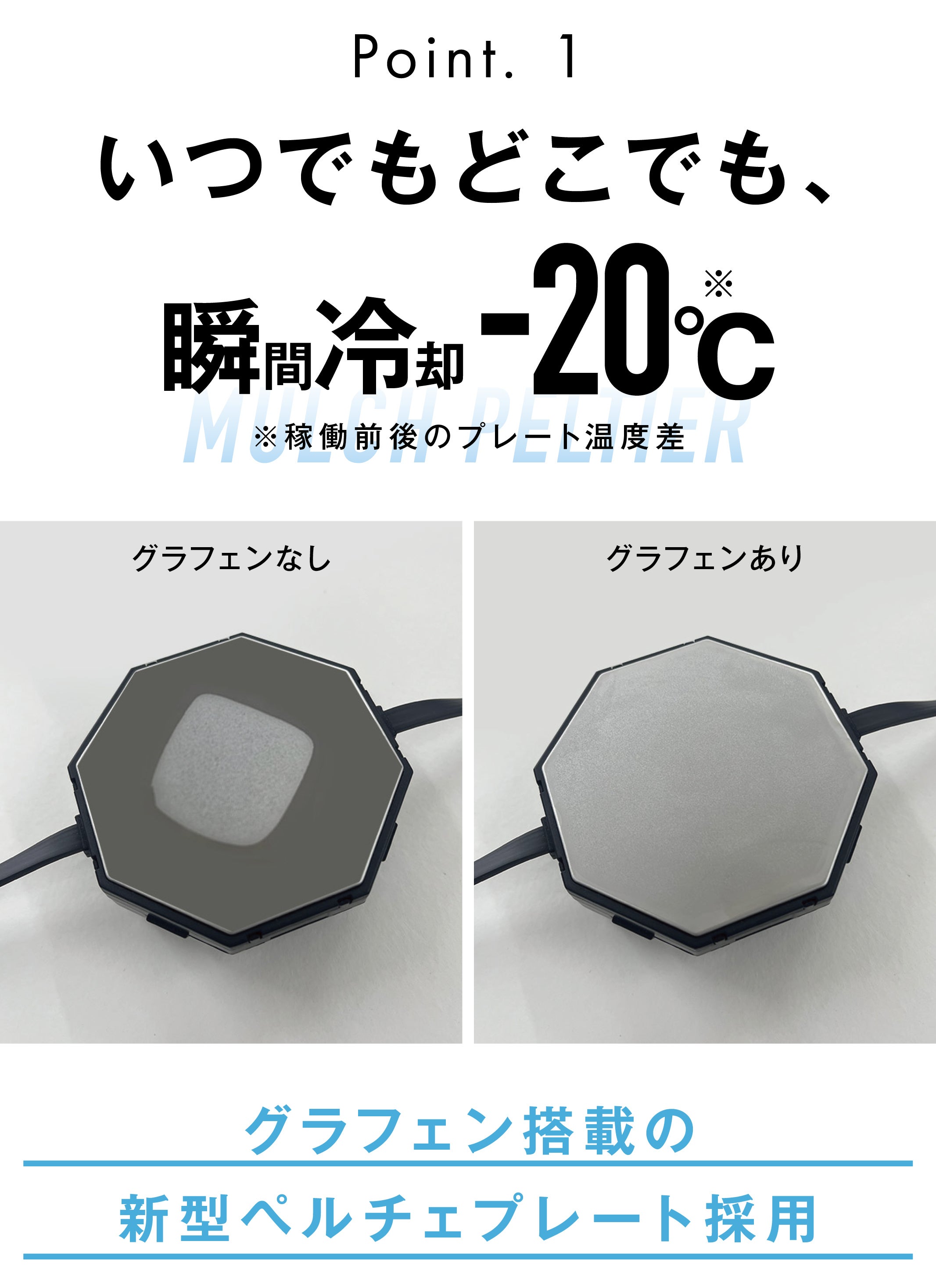 ペルチェ素子を採用した「ペルチェデバイス」なら、瞬間冷却-20℃(※)を実現。まるで冷凍庫に入れたアルミプレートのような冷たさが、スイッチを入れて数秒で訪れます。